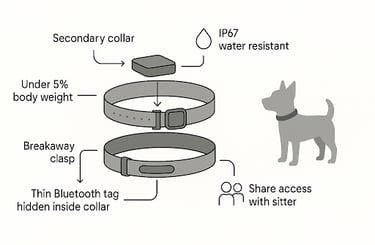Discreet mounting. Use security screws, VHB tape, or zip ties with a dab of epoxy. Keep pet devices under five per cent of body weight and use a breakaway collar.