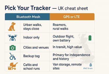 Pick the right tech: GPS vs Bluetooth tracker explained, with practical tips for pet tracker uk and drone tracker uk with mounts, sharing, alerts, and battery habits.