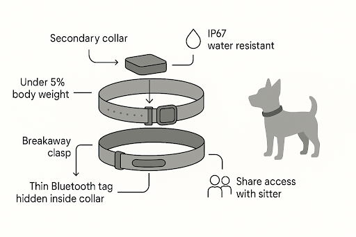 Collar sandwich for escape artists. Pair a Bluetooth tag inside the collar with a micro GPS on a second collar. For owners comparing pet tracker UK options, this hybrid covers quick home recoveries and longer walks.