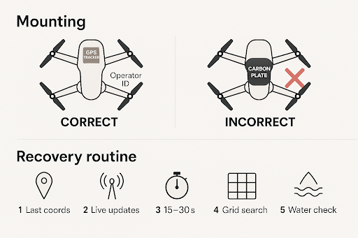Belly mount with clear sky view. Fit a slim GPS on the top or belly, not under carbon plates. A drone tracker in the UK should run on its own battery so a crash does not silence it.